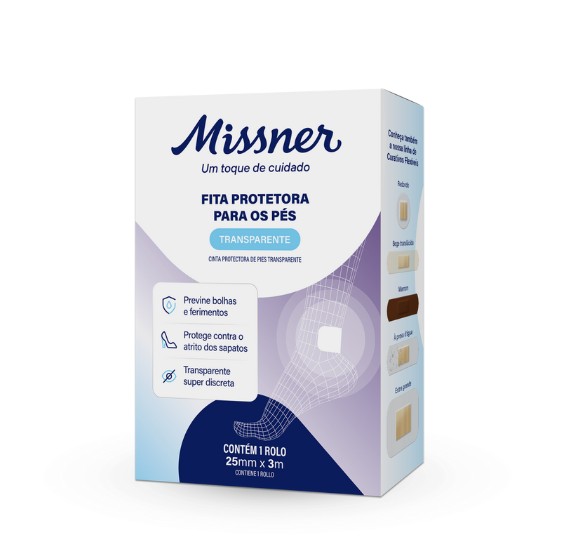 A Fita Protetora para os Pés Missner 2,5cm x 3m é discreta, flexível, resistente e impermeável.